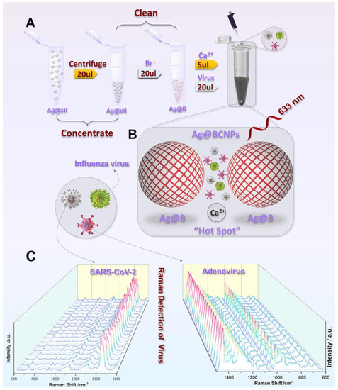 Another new SERS detection system was developed by Zhang et al. They used citrate to reduce AgNPs and added acetonitrile solvent to form a “hot spot” suitable for the capture of viruses. By adding Ca2+ and the virus sample together, they detected the human adenovirus and SARS-CoV-2 without the use of a marker [89]. They showed an LOD of 100 PFU/test for these viruses within 1 to 2 min using machine learning techniques. Figure 12 shows the experimental process where AgNPs were modified by bromide ions and acetonitrile, and the generation of hot spots with Ca2+ addition.