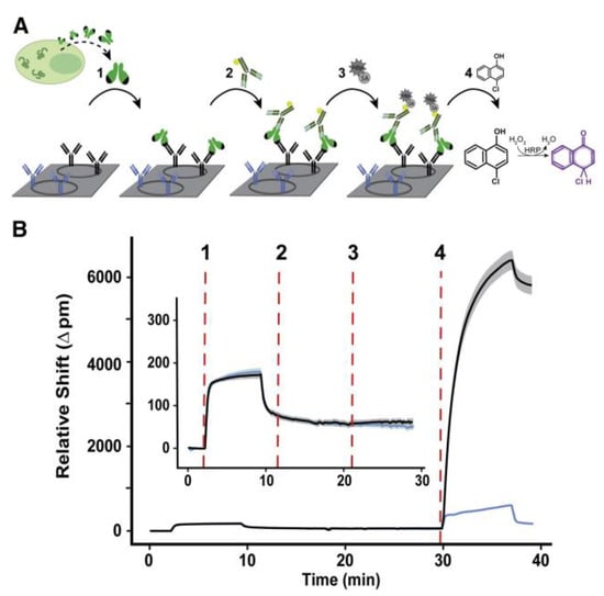 As another type of resonator-based sensor, ring resonators have been preferred owing to their unique potential to be coupled in high-throughput arrays efficiently for multiplexed analysis [97,98]. The rapid detection of an Ebola virus (EBOV) biomarker with optical microring resonators was performed by Qavi et al. [99]. Soluble glycoprotein (sGP) is the primary product of the glycoprotein (GP) gene of the EBOV, which is a nonstructural secreted GP that is expressed from the unedited RNA transcript. There are several roles sGP appears to play in EBOV pathogenesis; therefore, it is useful to be utilized as a biomarker in virus detection. In this study, the authors developed a sensor by adapting a silicon photon microring resonator platform to detect EBOV sGP (Figure 13). They used an HRP-dependent sandwich immunoassay to increase the sensitivity and specificity of the assay. The sensitivity is increased due to the precipitate localization on the sensor surface as a result of the enzymatic reaction, providing signal amplification. The sensitivity is enhanced through the use of a secondary antibody since any non-specifically bound molecules on the surface would not be recognized by the secondary antibody. The microring resonator sensor detected sGP in under 40 min with an LOD of 1.00 ng/mL in serum, a much higher analytical sensitivity than the ELISA tests.