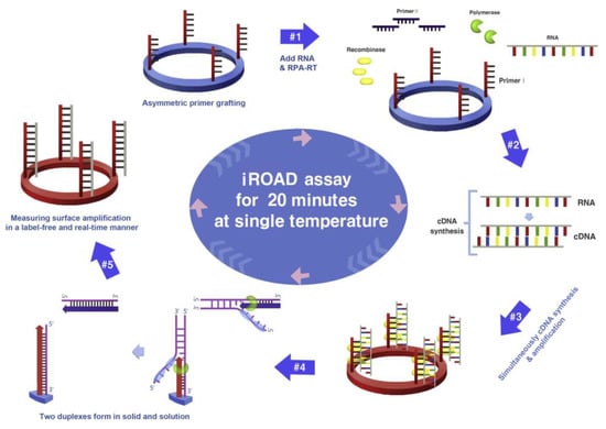 Schematic representation of iROAD assay, which involves an isothermal RNA amplification and label-free detection. (1) iROAD chip preparation by forward primer grafting on the sensor. (2) Addition of the recombinase polymerase amplification (RPA) reagents, reverse primers, and extracted RNA. (3) cDNA synthesis from the RNA template using RT-RPA. (4) Binding of recombinase–primer complexes to cDNA for strand exchange. When the displaced strand makes a D-loop by gp32 (sky blue), primers on the microring surface are extended by polymerase (light green). (5) Formation of two duplexes in solid and solution. The amplification is detected by measuring the wavelength shift on the microring resonator for 20 min. Reproduced with permission from [100] Copyright © 2017 Elsevier.