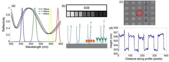 Interferometric reflectance imaging sensor (IRIS), developed by Ozkumur et al., is a label-free biosensor that can probe bimolecular interactions on a silicon/silicon dioxide (Si/SiO2) substrate in a multiplexed microarray format [105,106]. The detection mechanism of IRIS depends on obtaining the interference signature of the reflected light from the Si/SiO2 substrate and measuring the optical thickness of the top layer (Figure 15). The substrate is a silicon chip with a thermally grown oxide layer that is spotted with capture probes that are specific for the target molecule. The binding of target molecules in the solution to the surface causes a height increase in the transparent oxide film, which in turn changes the optical path length difference (OPD). The intensity of the reflected light at a given wavelength is determined by the OPD between the top of the biomass layer and the Si/SiO2 interface. The thicker the biomass layer becomes, the higher the OPD becomes, and this increase in the OPD leads to a shift in the spectral reflectivity curve (Figure 15a) and a change in the reflected light intensity at a specific wavelength. In the IRIS optical setup, four LEDs with different wavelengths (455, 518, 598, and 635 nm) illuminate the substrate sequentially and the intensity of the reflected light is recorded with a CCD to generate an intensity image of the chip surface. Then, each pixel in this intensity image is fitted to the reflection function from which the thickness of the transparent film (oxide layer plus any biomass layer) is obtained. The calculated thickness difference for a given spot before and after analyte incubation is converted to biomass density using simple conversion factors, and an average mass density is calculated from replicate spots [107].