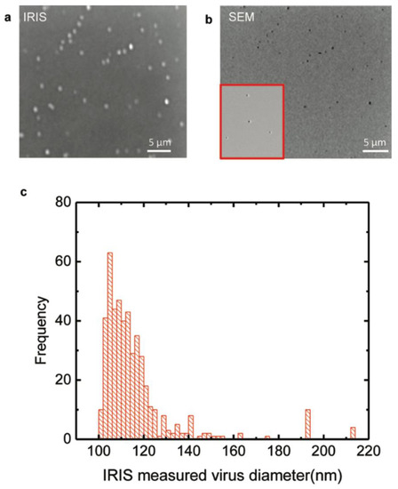 The study by Daaboul et al. was the first report to show SP-IRIS as a virus-detection platform by demonstrating the detection and sizing of individual H1N1 viruses [113]. In this work, H1N1 viruses were immobilized on the sensor surface and imaged using both SP-IRIS and scanning electron microscopy (SEM) for the exact same field of view. Their results showed a one-to-one correspondence between SP-IRIS and SEM images, confirming that the particles observed in the SP-IRIS system are virus particles, proving the sensor’s ability to detect individual viruses (Figure 17). In the same work, using the forward model mentioned before, they measured the mean size of the H1N1 particles as 116 nm with a size distribution of 17 nm, which is in good agreement with the reported H1N1 virus size in the literature.