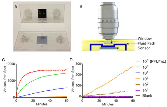 (A) Picture of the first-generation polymeric cartridge used for real-time virus imaging. (B) Cross-section model that demonstrates the fluidic path (in blue), the sensor (in gray), and the window (in yellow). Image is not to scale. (C) Accumulation of viruses being imaged on the sensor for a serial dilution ranging from 1 × 106 PFU/mL down to a blank sample. The high-concentration samples show a very rapid accumulation of viruses followed by the saturation of the sensor. (D) Lower concentrations expanded, showing a linear accumulation of viruses and a limit of detection of 100 PFU/mL in less than 60 min. Reproduced with permission from [121]. Copyright © 2016 American Chemical Society.