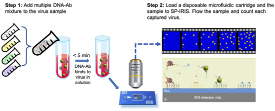 Besides the microfluidics integration and improvements in the optical setup of SP-IRIS, sensor-chip surface chemistry was also studied in an effort to increase the sensitivity of detection. By using a technique called DNA-directed antibody immobilization (DDI), Seymour et al. showed that capture antibodies can be elevated over the surface (~14 nm) through the use of DNA linkers attached to the antibodies [126]. This new surface-preparation technique provided a 16-fold increase in sensitivity for rVSV-EBOV detection for a 15 min incubation period. This improvement is most likely due to the increased accessibility of the antibodies for virus binding and increased functionality due to fewer surface attachment points in the antibody structure. This work was recently extended to a novel approach of mixing DNA–antibody conjugates and the virus sample in the solution phase before incubating the chip (Figure 20). This homogeneous method achieved a slightly better sensitivity than conventional DDI while decreasing the assay time [123]. Other advantages of this approach include a configurable sensor surface, reduced amount of antibody needed for the assay, and long shelf-life of the dried DNA–Ab conjugates.