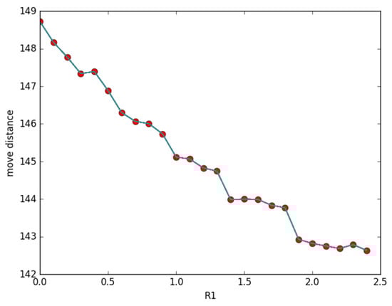 Figure 2 illustrates the changing conditions of the total moving distance according to variations in the sensing radius. We also use the same curve function, y, to generate 80 discrete points in the path, and then deploy 120 nodes randomly in the region. R1 ranges from 0 to 2.5 m, and the other parameters are set as d = 0.5, β = 0.5, and R2 = 5 m, respectively. It can be noticed from Figure 2 that moving distance decreases gradually in accordance with the increase in R1. This is because when R1 increases, the covering probability of all discrete points around it will become larger.