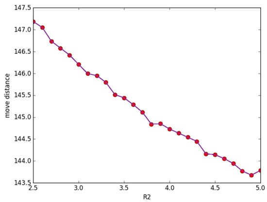 Figure 3 plots how the total moving distance changes according to R2. The parameters evaluating covering performance are set as R1 = 2.5, d = 0.5, and β = 0.5, respectively, while R2 changes from 2.5 m to 5 m. The other parameters are the same as in Figure 2. We observe that in Figure 3, with the increase of R2, the moving distance decreases. This phenomenon is caused by some discrete points being out of monitoring at the beginning while they are covered by nodes with the increase in R2.