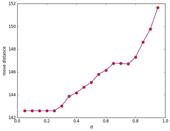 Figure 4 presents the changing condition of moving distance according to threshold d. In the initialized phase, we randomly produce 120 sensors in the monitoring area. Additionally, the same path function as in Figure 1 is taken to generate 80 discrete points. The covering probability threshold is ranged in (0.05, 0.95), and the other parameters are set as β = 0.5, R1 =2.5, and R2 = 5, respectively. We change the covering probability threshold d gradually. It can be observed from Figure 4 that, with the increase in d, the moving distance increases accordingly.