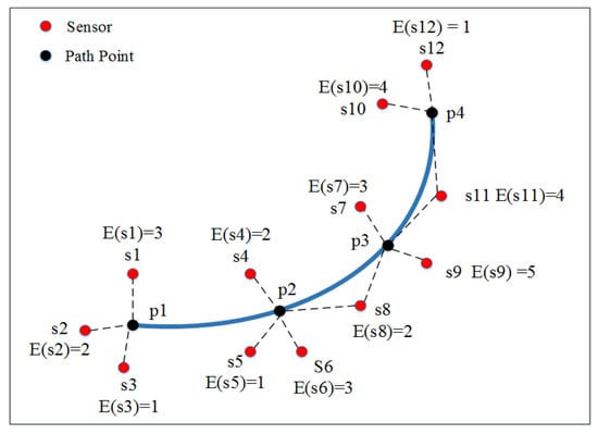 As illustrated in the network in Figure 6, twelve nodes and four points are located in the area. According to the definitions, here we have E(s1) = 3, S(p1) = {s1, s2, s3}, and C(s8) = {p2, p3}.