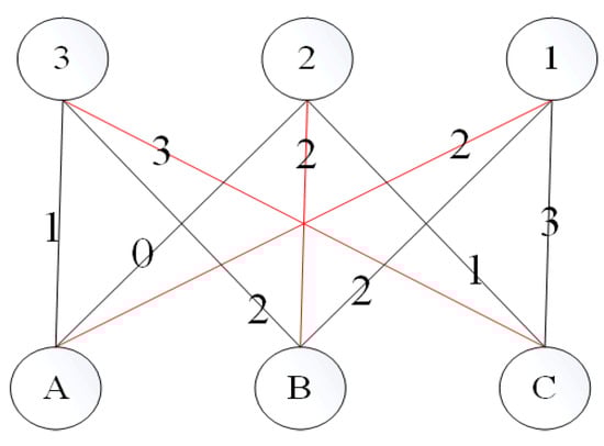 Largest Weighted bipartite Match (noted as LWM in later chapters). A match is defined in a graph G as a collection of edges that are vertex-disjoint. For a weighted bipartite graph, if the summation of values of all edges is the largest among all situations, then the weighted bipartite graph value is called LRM. As in Figure 7, A,B,C and 1,2,3 within each circle represents six different vertices, while the other numbers represent the value of each edge, respectively. Here LRM is {(1, A), (2, B), (3, C)}, with the summation of values even.