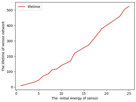 The effect of the least initial battery level on the largest lifetime is given in Figure 9. Here, 200 nodes are located randomly around 10 discrete points in the path, and each node is equipped with the same battery initially. From Figure 9, we observe that the coverage lifetime also increases with the increase in the initial battery level of nodes, which enables nodes to monitor for a longer time.
