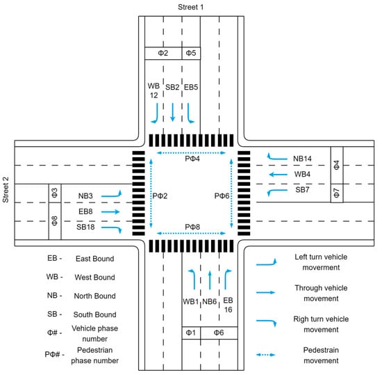 The traffic lights control the vehicle and pedestrian flow at intersections where traffic travels in different directions. The traffic flows moving in various directions are called movements and are categorized as left-turn, through, right-turn, and pedestrian movements, as shown in Figure 1. To differentiate the traffic flows, each movement is identified by a separate number (HCM) [4]. The traffic signal phases are then used to group certain movements, which allows the traffic to move in an orderly manner.