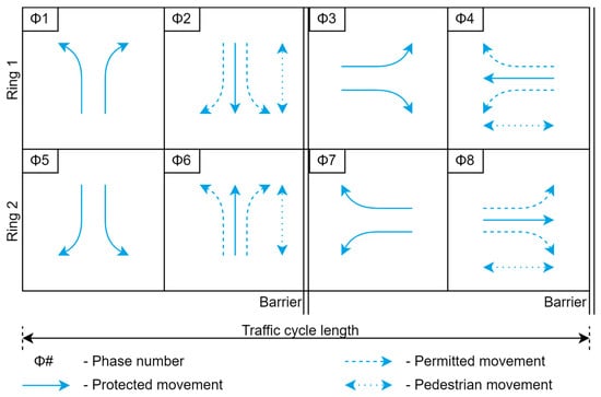 Figure 2 depicts a ring and barrier diagram for an 8-phase intersection. In this diagram, rings organize phases so that they are synchronized without interference and consist of a series of competing stages. At barriers, phases in both rings conclude concurrently. This enables dual or two-ring operations, allowing compatible phases to run concurrently with those of the opposite ring. The phases are an important part of the system as they control the timing and sequence of the green, yellow, and red lights for the incoming traffic movements at the intersection. Typically, they distinguish between major and minor street segments. Additionally, the movements are categorized as permitted and protected movements.
