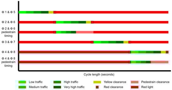 Then, the timing of the green light for each phase is estimated using Equations (5) and (6) [36] for four traffic conditions. This time is determined based on the expected cycle length and critical movement analysis.