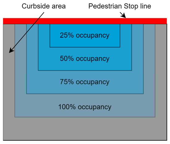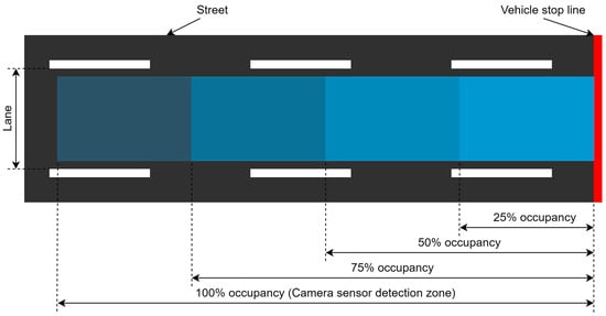 The occupancy zone is divided into four segments, as shown in Figure 5 and Figure 6 for vehicles and pedestrians, respectively, according to the critical volumes for each category of traffic. Each segment represents the number of vehicles/pedestrians that will be waiting at the red light with respect to the critical volume. The traffic will occupy a certain area of the zone and the number of vehicles and pedestrians will be calculated based on these four segments. For the pedestrians, the cameras will take the image of curbside where pedestrians wait on a red signal. The traffic category and its respective occupancy percentages are given in Table 2. The 100% occupancy is the area under the detection where the camera sensor can clearly see vehicles and pedestrians.