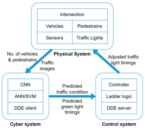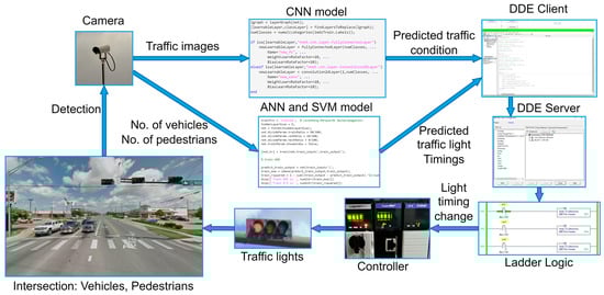 The operation of the smart traffic light control system is given in Figure 8. The proposed system’s role is to detect traffic conditions and regulate intersection traffic lights. The sensors are cameras that supply the information required by the cyber system. The CNN model determines the traffic category, while the ANN/SVM predicts green light timings based on traffic photos, vehicle count, and pedestrian count. After that, the anticipated values are saved in the DDE client file, which communicates with the DDE server and ladder logic. To eliminate delays, the smart traffic light control system can adjust the timing of the green and red lights based on predictions. MATLAB was used to create machine learning models. Visual Basic for Applications (VBA) was used to convey data to ladder logic, and the control system runs on the RSLinx Classic and RSLogix platforms.