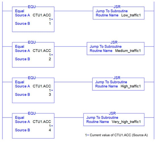 In this work, the ladder logic is separated into main routines and sub-routines. The main routine is the primary program that controls the overall operation of the system. It consists of a series of rungs that are executed sequentially, with each rung controlling a specific sub-routine, as shown in Figure 11. The sub-routines represent the timing operation of the low, medium, high, and very high categories, as shown in Figure 12. Sub-routines can be called from within the main routine, allowing them to be used as building blocks to create more complex control systems.