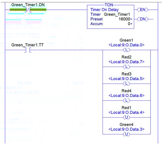 A ladder logic program is utilized to implement the dynamic traffic interval strategy. It is a programming language used in programmable logic controllers (PLCs) to create control systems for industrial processes and machines. The language is based on ladder diagrams, which represent the physical components of the control system, such as traffic lights, and the logic that connects them.