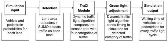Li et al. [18] used cameras to capture images or videos of traffic conditions and applied machine learning algorithms to analyze and interpret the data. Wiering et al. [19] simulated an intelligent model using reinforcement learning to optimize the traffic light setting. They evaluated the performance of their technique on a group of intersections by making decisions based on vehicles at the traffic intersection. This method is more focused on optimizing traffic light parameters and, thus, there is no mention of the sensors to collect the data.