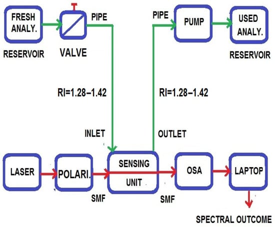 Figure 1 shows the experimental setup and operating principle of the proposed sensor. The setup includes various components, such as light amplification by stimulated emission of radiation (laser), an optical polarizer, a sensing unit, an optical spectrum analyzer (OSA), a laptop, a programmable pump, an analyte reservoir, and more. The laser light is coupled into the optical polarizer unit using an SMF fiber, which converts unpolarized light into polarized light and passes it through the sensing unit. Analyte is also introduced into the sensing unit using the PVC pipe, and the valve controls the flow of analyte with a standard pressure and temperature. The programmable pump circulates the analytes into the sensing unit step by step and finally discharges them into the waste reservoir. The interaction between the free electrons of plasmonic material and photons of the evanescent optical field takes place in the sensing unit. The OSA receives the polarized light signal from the sensing unit using SMF and quantifies the optical spectra. The laptop gathers the quantified optical spectra from OSA using SMF and displays the resonance peak loss curve as a monitor corresponding to each unknown analyte with a distinct resonance wavelength. By analyzing the resonance peak loss curve, the sensor is capable of detecting and identifying different analytes with high precision.