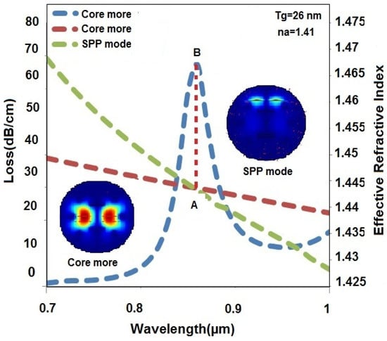 Figure 3 shows the maximum photon energy transfers from the core mode to the surface plasmon polariton (SPP) mode at resonance condition or phase matching condition. The blue and brick-colored dashed lines in Figure 3 characterize the loss and real part of the effective RI of the core mode, respectively. Furthermore, the green dashed line characterizes the effective RI of the SPP mode. From Figure 3, it can be observed that the loss of the core mode increases with increasing wavelength up to the resonance point (B) and later starts decreasing with increasing wavelength. On the other hand, the real part of effective RIs of the core mode and SPP mode decrease with increasing wavelength. Additionally, the real part of effective RI of the core mode suitable matches the effective RI of SPP mode and satisfies the resonance condition. In Figure 3, the resonance occurs at λ = 0.86 µm wavelength, and maximum photon energy transfers from the core mode to the SPP mode instantaneously. This resonance condition is crucial for the operation of the proposed sensor because it enables efficient and accurate detection of various analytes based on the interaction between the plasmonic material and the photons of the evanescent optical field.