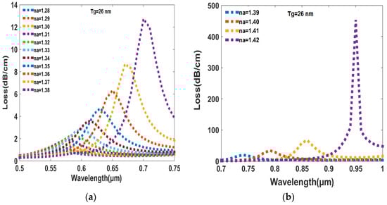 In Figure 4a,b, the peak amplitude and resonance wavelength are shown as functions of the RI of the analyte. It can be observed that as the RI of the analyte increases, the peak loss and resonance wavelength shift towards higher wavelengths. This is because a higher RI of the analyte allows for more efficient transfer of photon energy from the core mode to the SPP mode, leading to a stronger interaction between the plasmonic material and the analyte. In Figure 4a, the lowest RI of 1.28 provides a peak loss and resonance wavelength of 1.1256 dB/cm and 0.56 µm, respectively. On the other hand, in Figure 4b, the highest analyte RI of 1.42 provides a peak loss and resonance wavelength of 775.7314 dB/cm and 0.95 µm, respectively. This indicates that the peak loss and resonance wavelength increase with increasing RI of the analyte.