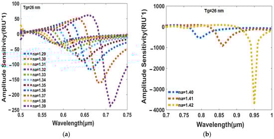 (a) The amplitude sensitivity varies with wavelength across the RI range of analytes from 1.29 to 1.39. (b) The wavelength-dependent variation of amplitude sensitivity occurs within the RI range of analytes from 1.40 to 1.42.
