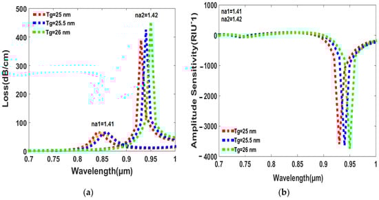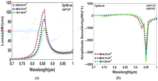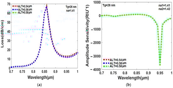 The peak loss is regulated by the thickness of the analyte layer as shown in Figure 11a. In Figure 11a, the peak losses are found to be 67.8950 dB/cm, 67.6150 dB/cm, and 67.3408 dB/cm for analyte layer thicknesses of 0.54 µm, 0.56 µm, and 0.58 µm, respectively. The highest analyte thickness of 0.58 µm provides the least peak loss of 67.3408 dB, and the resonance wavelength does not shift towards the higher wavelength with increasing analyte layer thickness. This is because a small damping loss occurs with increasing analyte layer thickness, which stabilizes the resonance wavelength in a fixed position. In Figure 11b, a similar trend is realized in which the amplitude sensitivity of the sensor is affected by the thicknesses of the analyte layer. In particular, the amplitude sensitivity is found to increase with increasing analyte layer thickness, as denoted by the values of 3457 RIU−1, 3596 RIU−1, and 3746 RIU−1 for analyte layer thicknesses of 0.54 µm, 0.56 µm, and 0.58 µm, respectively. Moreover, when the analyte layer thickness is less than 0.54 µm or greater than 0.58 µm, the sensor cannot detect x-polarized direction and y-polarized direction light signals in the core area, which are necessary to calculate sensing parameters. The peak loss and amplitude sensitivity vary slightly with changing analyte layer thickness. Therefore, Figure 11a,b cannot display peak loss and amplitude sensitivity outcomes clearly according to their respective colors.
