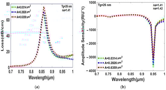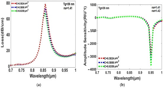 The peak loss and amplitude sensitivity are dominated by the circular air hole area of the cladding for the RI range of the analyte from 1.41 to 1.42, and the thickness of the gold layer is 26 nm. The peak loss and amplitude sensitivity of the sensor vary with the circular air hole area of the cladding as presented in Figure 9a,b. In Figure 9a, the maximum air hole area of 0.6359 µm2 displays the minimum peak loss, which is considered the best value for detecting the RI of analyte. In Figure 9b, a similar trend is found in which the maximum air hole area of 0.6359 µm2 provides the maximum amplitude sensitivity, with a value of 3746 RIU−1, compared to the minimum areas of 2943 RIU−1 and 3350 RIU−1 for air hole areas of 0.5024 µm2 and 0.5806 µm2, respectively. Therefore, the maximum air hole area of 0.6359 µm2 is selected as the optimal value for both peak loss and amplitude sensitivity.