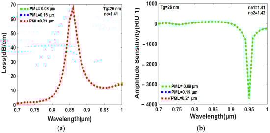 The peak loss and amplitude sensitivity change with the perfectly matched layer (PML) thickness, as displayed in Figure 10a,b. Figure 10a shows that the minimum PML thickness of 0.08 µm offers the lowest peak loss of 67.3408 dB/cm for the RI of 1.41, and the resonance wavelength does not shift towards higher wavelengths with increasing PML thickness. This is because a small amount of damping loss occurs with increasing PML thickness, which keeps the resonance wavelength in a fixed position. Figure 10b shows that the lower PML thickness of 0.08 µm provides the highest amplitude sensitivity of 3746 RIU−1 for the RI range of 1.41 to 1.42. The suggested structure is expected to display good sensing performance with a minimum PML thickness of 0.08 µm. It is noted that both peak loss and amplitude sensitivity slightly change with the PML thicknesses. However, the legend colors (red, blue, green) in Figure 10a,b are not able to display the loss and amplitude sensitivity results separately.