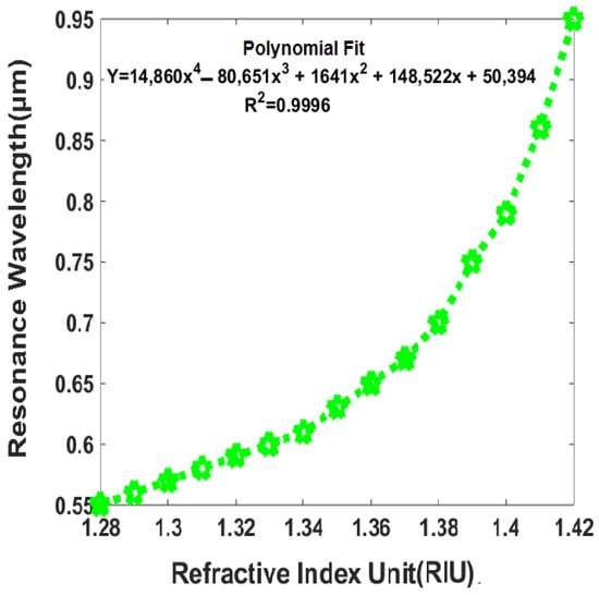 The polynomial fitting curve presented in Figure 12 provides a useful tool for predicting the resonance wavelength of the PCF-SPR sensor in response to changes in the RI of analytes. The formula of polynomial curve fitting states as Y = 14,680x4 − 80,650x3 + 1641x2 + 148,522x + 50,394, where Y represents the resonance wavelength and x represents the RI of the analyte. The researchers can estimate the expected resonance wavelength for a given change in RI using the formula: The high squared value of 0.9996 indicates that the polynomial fitting curve provides an accurate representation of the relationship between resonance wavelength and RI. This information is crucial for designing and optimizing sensors for particular applications.