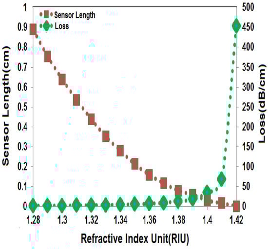 As shown in Figure 13, both the sensor length and loss depend on the RI of the analyte. Figure 13 indicates that the analyte with a minimum RI of 1.28 results in the maximum sensor length, whereas the analyte with a maximum RI of 1.42 results in the minimum sensor length. Correspondingly, the analyte with a minimum RI of 1.28 leads to the minimum loss, while the analyte with a maximum RI of 1.42 causes the maximum loss. In general, the sensor length and loss have an inverse relationship in which an increase in sensor length leads to a decrease in loss.