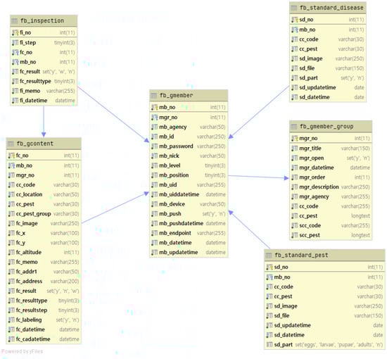 Figure 2 shows the design of the database structure for the main tables used in the system. The fb_standard_pest and fb_standard_disease tables in the database store information about uploaded pest and disease images, respectively. The fb_gmember table stores users’ information, while the fb_gcontent table stores metadata related to the images uploaded by users. The metadata includes information such as the crop type, pest or disease type, and shooting location, and is linked to the table that stores information about the uploaded images using foreign keys. The fb_inspection table is used to record the results of pest and disease expert inspection for each image. This table is connected to the fb_gcontent and fb_gmember tables using foreign keys to manage the metadata of the images to be inspected and the information of the users who uploaded the images.