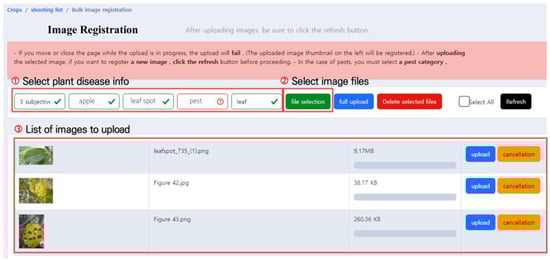 The pest and disease image upload screen is shown in Figure 3. Users should first select the crop pest and disease information for the image to be uploaded, as shown in Figure 3. ➀, and select the affiliation of the uploader, crop type, pest, or disease type, form of the pest (only applicable for pests), and the affected area. Seven uploader affiliations are currently defined, and each affiliation handles different types of crops, pests, and diseases. There are 32 types of crops, such as apples and pears, and users can select pests and diseases that occur in the chosen crop from a given list. Users can only select the pest from the pest category in the previous pest and disease selection step, and there are four categories to select from: egg, larva, adult, and damage caused by pests. Finally, when selecting the affected area, users can specify the damaged part of the crop, such as leaves, fruit, stems, or roots.