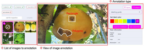 The pest and disease image annotation screen is shown in Figure 5. Figure 5. ➀ is the annotation image waiting list, which displays the uploaded images. Upon clicking an image, it is enlarged and displayed as shown in Figure 5. ➁, and the affected areas can be marked. For annotation, rectangles and polygons are supported. Images marked with rectangles can be used in object detection tasks, and the annotation information contains coordinate values in the format (). As pest and disease symptoms have various forms, there are limitations to marking them with rectangles. To solve this, a feature was added to allow marking in polygon format, which enabled users to mark complex damage symptoms more precisely. Images marked with polygons can be used in object detection and segmentation tasks. The annotation information is automatically saved in a separate JSON file.