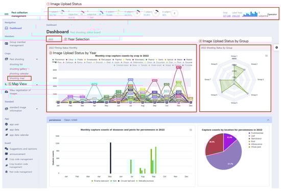 Using the Year Selection feature in Figure 7. ②, users can select a specific year and view the corresponding task statistics. The feature Image Upload Status by Year in Figure 7. ③ visualizes the number of uploaded pest and disease images using a line graph and it shows the number of image uploads for each crop per month. The status of images uploaded in each group is displayed in Figure 7. ④ using a radar chart, making it convenient to check the group with the most or least uploaded images.
