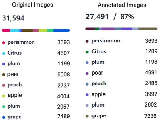 AIHub [20], an AI training data platform, provides large-scale pest and disease datasets, such as the fire blight shooting image dataset [21], open-field crop disease diagnosis image dataset [22], and open-field crop pest diagnosis image dataset [23]. The fire blight shooting image dataset [21] contains 9 classes and 211,555 images, and among the photographed images, 95,000 are normal images and 15,000 are disease images. Most images are normal images without diseases, and the disease images are generated through data augmentation techniques such as rotation and flipping. The open-field crop disease diagnosis image dataset [22] provides disease data for 10 types of open-field crops for disease diagnosis. This dataset contains 21 pest and disease classes and 349,151 images, but only 30,000 of them are original images, the rest are normal images or images obtained through data augmentation. The open-field crop pest diagnosis image dataset [23] provides pest image data of the 10 major open-field crops for the development of pest and pest damage diagnosis models and includes 20 classes and 502,530 images. Although AIHub provides large-scale pest and disease image datasets [21,22,23], most of them are normal images without diseases or pests, or images obtained through data augmentation, with only a small proportion of pest and disease images. Many long-distance shots and out-of-focus images are inaccurate for training data.