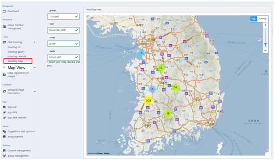 PlantInfoCMS supports a map view that allows the user to check the pest and disease image upload status by region. Map View, featured in Figure 7. ⑤, allows users to easily identify the shooting location and distribution of the uploaded images. The map view, as shown in Figure 9, was implemented using the metadata of the image (e.g., location). The shooting location metadata of the image is stored to one day expand the system into a control system in the future.
