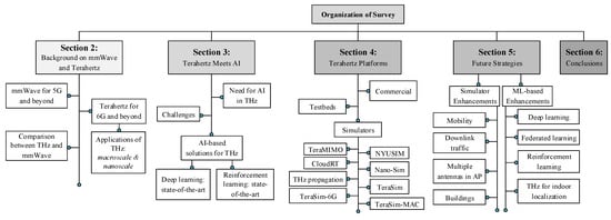 Figure 2 illustrates the hierarchical structure of the survey, where Section 2 presents a detailed background on and THz along with THz applications and a comparative study of and THz. Section 3 presents the need for AI in THz, challenges, the state of the art using DL and RL with their potentials, and shortcomings. Section 4 provides an overview and analysis of THz platforms, including commercial, Testbeds, and publicly available network simulators. Section 5 suggests future strategies in improving THz communication using simulation and AI methods. Finally, the last Section 6 provides concluding remarks on this survey paper.