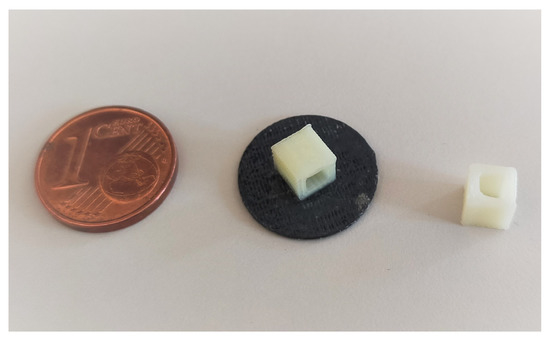 3D thermographic markers (3DTM) were conceived to facilitate and access the quality of the spatial registration of the thermal images on the 3D mesh. The 3DTM were developed to be small objects of known geometry that could be visible both in the 3D mesh and in the thermal image, and that could be positioned on the subject’s body without obstructing clinically relevant hot/cold spots on the residual limb [19,21]. To fulfill these constraints, we 3D-printed small hollow cubes in ABS, with only 4 lateral faces, with an edge length of 5 mm with a 0.5 mm think flat base of 14 mm in diameter (Figure 1).