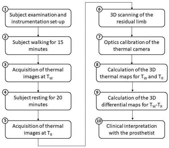 The workflow was developed to collect the skin temperature of the residual limb of a person with transtibial amputation under two conditions, to superimpose the two temperatures dataset on a single 3D model of the residual limb and to calculate a 3D differential thermal map to highlight the temperature variations between the two conditions. For instance, the two conditions can be assumed to be the skin temperature after walking (TW) and at rest (TR). The 10-phases workflow is illustrated in Figure 2. The steps are described in detail in the next sections.