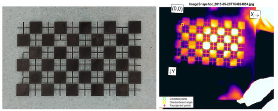 The Matlab Camera Calibration App (Mathworks, Natick, MA, USA) is used to calibrate the optics of the thermal camera. A rectangular chessboard composed of 30 × 30 mm black squares interconnected by thin crosses were 3D-printed in ABS to generate a bi-dimensional calibration pattern (Figure 4, left). The chessboard has a size of 300 × 180 mm, with a thickness of 2 mm and was glued on a clear, rigid PETG board, which is easy to find in prosthetic and orthotic facilities. Once heated by hand rubbing, the ABS chessboard becomes clearly visible in the thermal images (Figure 4, right).