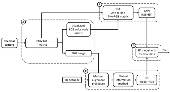 Once this step was completed, the process split in two branches, namely B and C, to then re-converge into the final branch D to generate the 3D thermographic map.