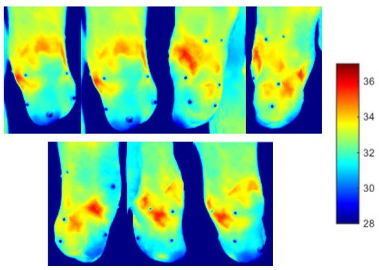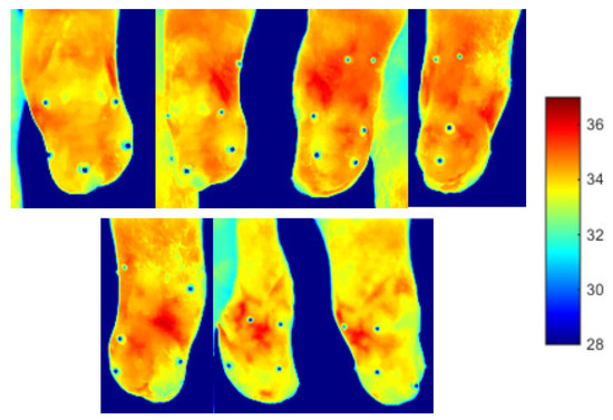 Thermal images obtained after 15 min of rest. The thermal markers are visible on the surface of the limb.