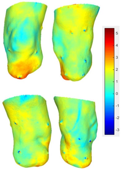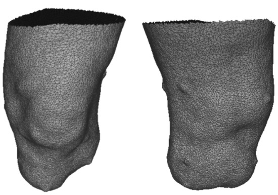 After less than 90 s of acquisition, a 3D surface of the scene with about 1 million vertices was obtained. After the extraction of the ROI and the elimination of all internal vertices of the residual limb surface and mesh refinement, a 3D model of the limb with about 16 thousand vertices was obtained (Figure 8).