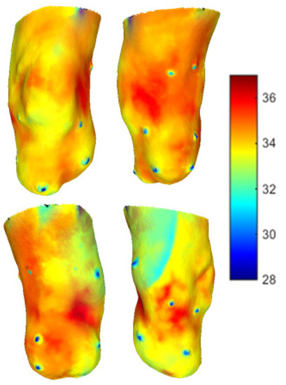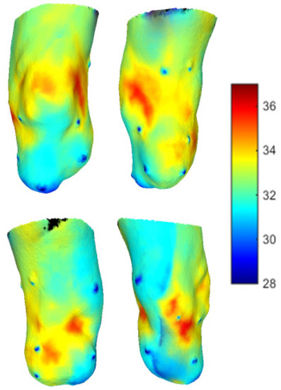 In [18] the residual limb skin temperature during prosthesis use was monitored. The results showed that temperature variations over the limb surface were associated with prosthetic socket material and subject activity. In [19], the authors investigated the application of 2D thermography to assess the stump–socket interface in transtibial prosthesis users by comparing the thermal maps induced by the mechanical stresses on the limb. By using thermography and temperature sensors fitted in the socket, five hot spots were identified before and after walking. In [20], the biomechanical and thermographic analysis of the transtibial limb–socket interface was investigated. The study demonstrated that the use of thermal imaging for detecting pressure points in the socket is a suitable method for rapidly assessing the quality of the socket during its manufacturing process. In [21], 16 subjects with transfemoral amputation were monitored through 2D thermography to investigate the effect of prosthesis misalignment on the skin temperature of the limb. The results showed that prosthesis misalignment induced a variation in the temperature distribution on the limb and that, therefore, thermography can be adopted to refine the prosthesis alignment.