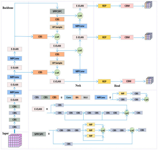 The entire model consists of four parts: the input end (Input), the backbone network (Backbone), the neck (Neck), and the prediction head (Head) [32]. The image input to the model is scaled to a uniform pixel size and enters the backbone network. The backbone network is mainly composed of CBS convolutional layers, E-ELAN modules, MPConv modules, and SPPCSPC modules. Among them, CBS convolutional layers are used to extract image features preliminarily; E-ELAN is improved on the basis of ELAN, using similar feature aggregation and feature transfer processes, controlling different lengths of connection paths, thereby obtaining richer features, and improving the calculation and utilization efficiency of model parameters; MPConv extracts features through two branches up and down, using both max pooling and convolution operations, and it fuses features through the Concat operation to enable the network to extract more effective information; the SPPCSPC module fuses feature information of different receptive fields, avoiding redundant feature extraction from the image and improving the expressive ability of feature maps.