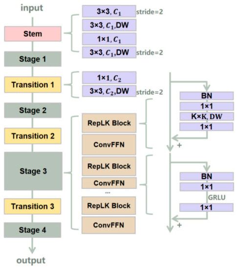 RepLKNet [34] uses large-size convolutional kernels to better preserve structural information in images while reducing information loss and blurring. The use of repeated layer structures further increases the depth and complexity of the network, improving the performance of image classification. Introducing large convolutional kernels significantly improves the effective receptive field compared to stacking small convolutions, guiding the network to learn more shape features. The network structure of RepLKNet is shown in Figure 5.