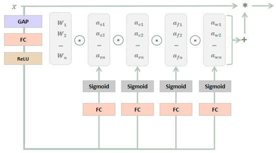 , respectively, represent attention along the spatial, input channel, and output channel dimensions, and represents the attention scalar of the convolutional kernel . These four types of attentions complement each other and are sequentially accumulated onto the convolution kernel Wi, based on position, channel, filter, and kernel order, making the convolution operation different for all spatial positions, input channels, filters, and all kernels of input x. Therefore, ODConv can significantly enhance the feature extraction capability of traditional CNN convolution operations, capturing richer contextual information. Moreover, by using fewer convolutional kernels, ODConv can achieve comparable or even better performance than DyConv [36] and CondConv [37].
