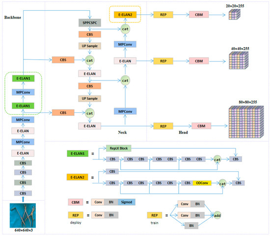 YOLOv7 exhibits superior performance in both inference speed and accuracy in object detection tasks through strategies, such as Effective Layer Aggregated Network (E-ELAN), model scaling, reparameterization, auxiliary training heads, and multi-label assignment [18]. The YOLOv7 series models are arranged from small to large in terms of network depth and width, which are YOLOv7-tiny, YOLOv7, YOLOv7x, YOLOv7-W6, YOLOv7-E6, YOLOv7-D6, and YOLOv7-E6E. In this paper, we chose the YOLOv7x model, which has high accuracy and fast detection speed, meeting the requirements of surgical instrument detection scenes. The model structure of YOLOv7x is shown in Figure 4.