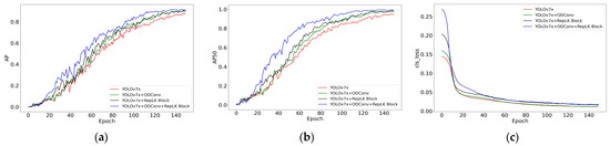 Comparison of different improvement methods on the validation set: (a) Comparison of the AP values for the different improved model; (b) Comparison of the AP50 values for the different improved model; (c) Comparison of the classification loss for the different improved model.