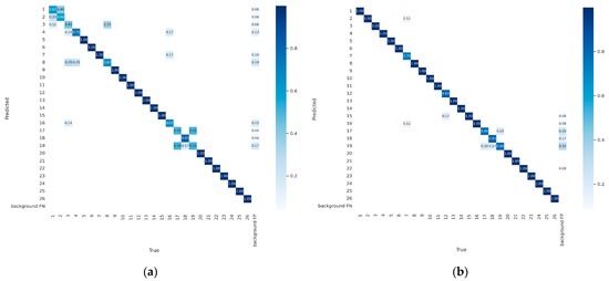Confusion Matrix between the original model and the improved model: (a) Detection effect of YOLOv7x; (b) Detection effect of improved model.